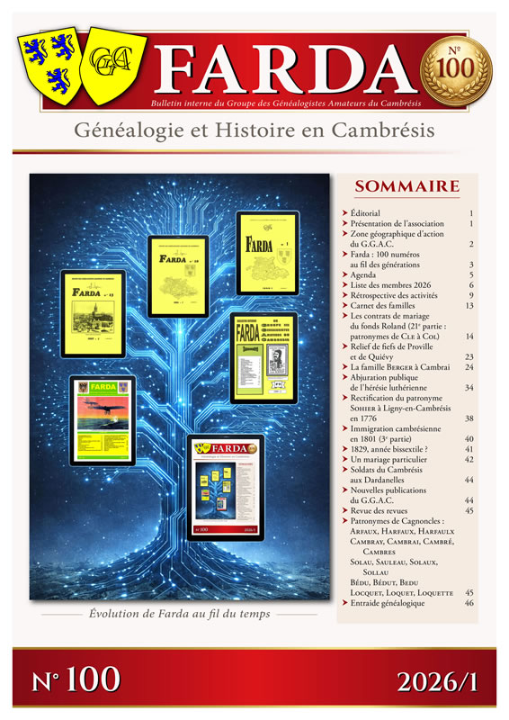 Depuis ses débuts, Farda s'est construit comme un lieu de rencontre entre passionnés de généalogie, un espace d'entraide où chaque question trouve un écho, où chaque réponse ouvre de nouvelles pistes. Au fil des années, cette revue a évolué dans sa forme, dans sa présentation, dans ses contenus tout en restant fidèle à ce qui fait son essence : relier les individus à leur histoire et les chercheurs entre eux.